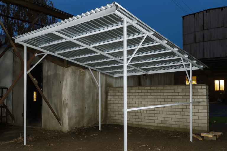 Изготовить навес из профильной трубы можно в сжатые сроки — технология позволяет точно рассчитать нагрузки и обеспечить надежность конструкции. Такие навесы подходят для небольших участков и просторных парковочных зон.